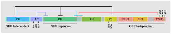 Structural domains of VAV1, their effector activities and control of its GEF activity. VAV1 protein contains the following domains: CH, calponin homology; Ac, acidic region; DH, Dbl homology; PH, pleckstrin homology; C1, a zinc like finger; NSH3, N-terminal SRC homology (SH3) domain; SH2, SRC homology 2; and CSH3, C-terminal SH3. Whether a region functions in GEF-dependent or -independent pathways is indicated beneath the region and is also detailed in the text. The intricate control of VAV1′s DH domain’s GEF activity by other domains of VAV1 is marked above the figure and explained in the text. Moreover, tyrosine residues that play a role in the control of VAV1 activity are marked. This figure was created with the BioRender.com program.