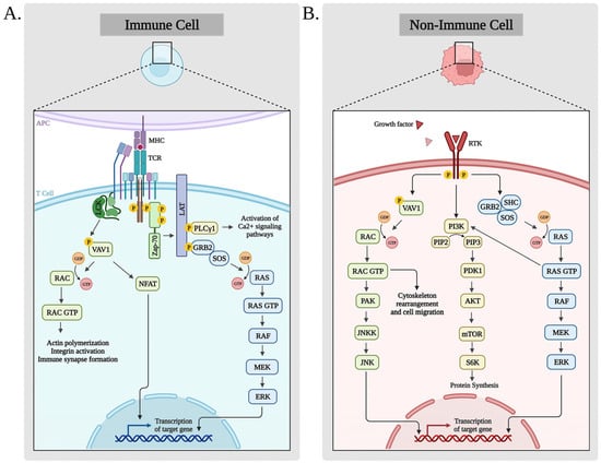 GEF-independent functions—These functions are primarily mediated by the association of VAV1 to other proteins through various adapter domains. For example, VAV1 plays a role in the activation of transcription factors such as NFAT, AP-1, and NF-kB [44,45] following TCR stimulation. It was demonstrated that VAV1’s capacity to initiate the release of calcium from T cells’ inner reservoirs is essential for this activity [45]. VAV1 can regulate apoptosis (programmed cell death) by modulating the activity of pro-apoptotic and anti-apoptotic signaling pathways [46]. VAV1 contributes to the DNA damage response by promoting cell survival and cell cycle progression in a GEF-independent manner [47]. VAV1 is also involved in the regulation of oxidative stress responses and serves as a scaffold protein to activate signaling pathways through protein–protein interactions [48]. In addition, VAV1 promotes extracellular signal-regulated kinase (ERK) and c-Jun N-terminal kinase (JNK) pathways [3,49,50]. It also initiates phospholipase Cγ1 stimulation following T cell receptor (TCR) activation and is involved in the recruitment of Son of Sevenless (Sos1) and Sos2 to the transmembrane adapter protein linker of activated T cells (LAT) [51].