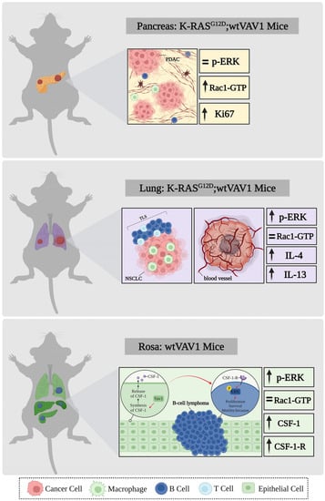Development of tumors in GEMMs expressing wild-type (wt.) VAV1 in various organs. Results of cancer development and signaling pathways in GEMMs expressing wtVAV1 either in the pancreas [81], lungs [83], or throughout various organs [82], crossed with mice expressing mutant KRAS (pancreas, lungs) or alone (Rosa: Vav1 mice) are depicted. The figure illustrates the status of RAC1 and ERK activities in each mouse model, in addition to changes in cytokine expression. This figure was created with the BioRender.com program.