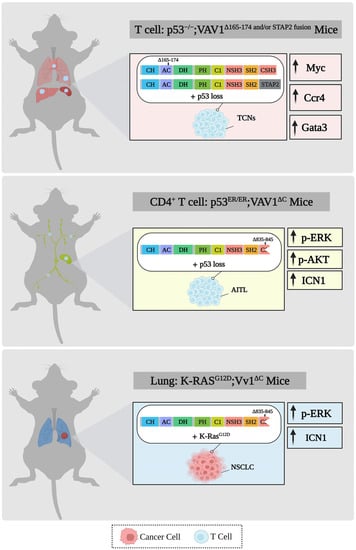 Development of tumors in GEMMs expressing mutant Vav1 genes in various organs. Results of cancer development and signaling pathways in GEMMs expressing Vav1Δ165−174 and/or STAP2 fusion and p53 deletion in the hematopoietic system are depicted [110]. Moreover, the results of GEMMs expressing Vav1ΔC and lacking p53 CD4+ T cells are demonstrated [111]. GEMMs that express Vav1ΔC together with mutant KRAS in the lungs are also described [111]. The various tumors developed in the various GEMMs are indicated. This figure was created with the BioRender.com program.