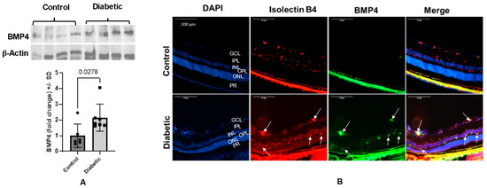 We explored the changes in BMP4 protein expression and localization in the postmortem human retina of diabetic retinopathy compared to non-diabetic subjects using immunofluorescence and Western blot techniques. For immunofluorescent staining, eyeballs were embedded in paraffin and then sectioned at 8 μm. The sections were de-paraffinized and incubated with anti-BMP4 primary antibody (Thermo Scientific, Waltham, MA, USA) at a concentration of 1:100 and the blood vessel marker Griffonia Simplicifolia Biotinylated Isolectin-B4 (Vector Lab, Newark, CA, USA) at a concentration of 15 μg/mL at 4 °C overnight. The sections were then washed with PBS–Triton X-100 two–three times. Then, the sections were incubated with the proper secondary antibodies, Oregon Green labeled to visualize the anti-BMP4 (1:500) and Texas Red Conjugated Avidin (7.5 μg/mL) (Vector Lab, Newark, CA, USA) to visualize the isolectin-B4 Invitrogen, Eugene, OR, USA), and cover-slipped with Fluoro-shield containing DAPI (Sigma-Aldrich, St. Louis, MO, USA) to label the nuclei. An Axioplan-2 fluorescent microscope (Carl Zeiss, Göttingen, Germany) with a high-resolution microscope (HRM) camera was used to capture images using the Zeiss Axiovision digital image processing software (version 4.8). A similar staining procedure was performed on mouse retinal cryosections. We first prepared retinal sections by embedding fresh mouse eyeballs inside the tissue. Tek Optical Cutting Temperature or O.C.T. compound (Sakura Finetek, Torrance, CA, USA) followed by cutting 12 μm thick retinal sections by a cryostat. Retinal sections were fixed in 4% for 10 min paraldehyde before.