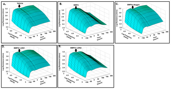 Three-dimensional model representation for the effect of BMP4 on HRECs barrier function. Thereafter, monolayers of HRECs were treated with BMP4 (50 ng/mL) in the presence or absence of noggin, LDN1, or LDN2. The barrier integrity (trans-endothelial electrical resistance or TER) was monitored over a 200 h period (z-axis), across various frequencies represented as log values on the x-axis. As shown in (B) BMP4-treatment reduced the TER compared to the vehicle (A). Noggin, LDN1, and LDN2 (C–E) reversed the effect of BMP4 on the TER of HRECs.
