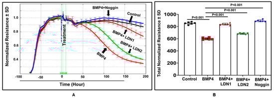 To study the changes in HRECs barrier function under various treatments, HRECs were grown in 96-well electrode arrays (catalog # 96W20idf PET, Applied Biophysics Inc., Troy, NY, USA) coated with 100 µM cysteine and 0.02% gelatin. After growing to confluence, cells were serum starved for 8 h. Cells were then treated with rhBMP4 (50 ng/mL: R&D Systems, Minneapolis, MN, USA) with or without the following inhibitors of BMP signaling: Noggin, (200 ng/mL; R&D Systems), LDN-193189 (LDN1, 200 nM; Sigma-Aldrich, St Louis, MO, USA), and LDN-212854 (LDN2, 200 nM; Sigma-Aldrich). The BMP was prepared by dissolving in 4 mM HCl (according to the manufacturer) and then diluted with the media to obtain our final concentration. The choice of BMP4 (50 ng/mL) for 48 h was based on our previous experience in which we had a consistent and optimal effect at this concentration [12,20,21]. LDN1 is a selective inhibitor of ALK2 and ALK3 with higher affinity to ALK3, while LDN2 is an inhibitor of ALK2 with weaker effects on ALK1 and ALK3 [25,26]. HRECs were also subjected to BMP4-treatment with or without inhibitors of VEGFR2 (SU5416, 10 μM: Sigma-Aldrich), endoplasmic reticulum (ER) stress inhibitor Phenylbutyric acid (PBA, 30 μmol/L; Sigma-Aldrich, St. Louis, MO, USA), p38 (SB202190, 10 μM; R&D Systems, Minneapolis, MN, USA) or ERK (U0126, 10 µM; R&D Systems). The changes in HRECs barrier function were assessed by measuring normalized transcellular electrical resistance (TER) using the electric cell-substrate impedance sensing [ECIS®Zθ (theta)] instrument (Applied Biophysics Inc.) as previously described [27,28,29]. On the other hand, ECIS provides real-time information on cell capacitance that reflects cell survival and adherence throughout the entire period of the experiment [30].
