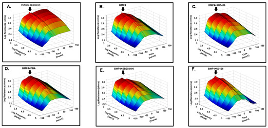 Three-dimensional model demonstration for the effect of BMP4 treatment on HRECs barrier function. The changes in HRECs barrier function after BMP4 treatment for 1–5 days with or without inhibitors of VEGFR2 (SU5416, 10 μM), endoplasmic reticulum (ER) stress inhibitor phenylbutyric acid (PBA, 30 μmol/L), p38 (SB202190) or ERK (U0126, 10 µM). BMP4-treatment was initiated after HRECs formed a confluent monolayer indicated by the plateau in the resistance (y-axis). The barrier integrity was monitored over 200 h period (represented on the z-axis) and across various frequencies represented as log values on the x-axis. As shown in (B) BMP4 treatment reduced the TER compared to the vehicle (A). VEGFR2 inhibitor (SU5416) and p38 inhibitor (SB202190) (C,E) partially reversed the effect of BMP4 on the TER of HRECs. ER stress inhibitor (PBA) and ERK (U0126) (D,F) have the least effect.