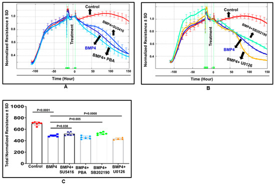 Normalized resistances of BMP4-treated HRECs estimated at a frequency of 4000 Hz by ECIS (A,B), and the statistical analysis (C). There was a significant decline in the resistances of HRECs with direct BMP4-treatment (50 ng/mL) over the experimental period in comparison to vehicle-treated control HRECs. There was a partial but significant restoration of TER in BMP4-treated HRECs by VEGFR2 inhibitor (SU5416) (between 50–100 h interval) and p38 pathway inhibitor (SB202190) (between 75–150 h interval) (p = 0.038, p = 0.005, respectively) compared to BMP4-treated cells. ERK inhibitor (U0126), and ER stress inhibitor (phenyl butyric acid or PBA) did not show any effects on TER. Results are presented as mean ± SD, n = 4–6/group; p < 0.01. Control: red line; BMP4 (50 ng/mL): dark-blue line; BMP4 (50 ng/mL) + VEGFR2 inhibitor (SU5416, 10 μM): light-blue line; BMP4 (50 ng/mL) + PBA (30 μmol/L): sky-blue line; BMP4 (50 ng/mL) + p38 pathway inhibitor (SB202190, 10 μM): green; and BMP4 (50 ng/mL) + ERK inhibitor (U0126, 10 μM): orange.