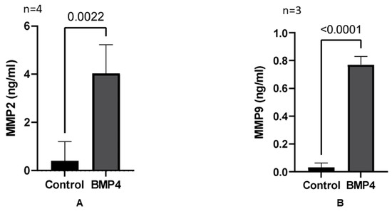 Matrix metalloproteinase (MMP) activity after BMP4-treatment (Sensolyte assay). (A) MMP-2 activity was significantly increased after exposure to BMP4 (~4-fold, p = 0.0022). (B) MMP-9 activity was significantly increased after exposure to BMP4 (~8-fold, p < 0.0001). The results are presented as mean ± SD; n = 3–4 per group.