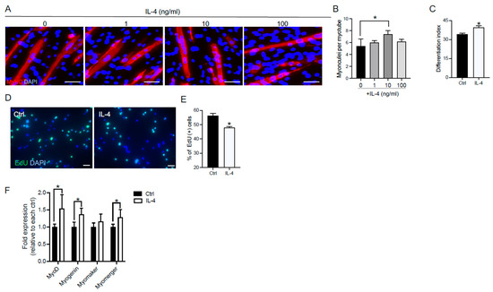 We first confirmed that IL-4 promotes myoblast fusion. C2C12 myoblast cells were treated with 1, 10, or 100 ng/mL IL-4 in DM—a low-serum differentiating condition—for 72 h, and immunocytochemical analysis was performed to examine myotube formation. Consistent with our previous studies [26], the number of myonuclei per myotube significantly increased by incubation with 10 ng/mL IL-4, thereby indicating that myoblast fusion was promoted (Figure 1A,B). Therefore, we used 10 ng/mL IL-4 in the following experiments.