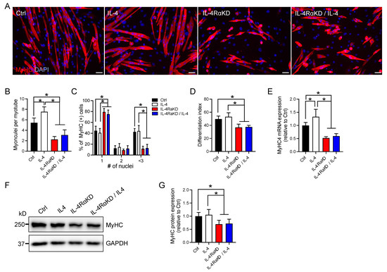 IL-4Rα knockdown impaired myoblast fusion and differentiation in C2C12 cells. (A) Representative immunofluorescence images of MyHC (red) in the IL-4RαKD C2C12 myoblasts. Cell nuclei were counterstained with DAPI (blue). Myotube formation was inhibited in the IL-4RαKD C2C12 cells. In this experiment, C2C12 cells were transfected with control siRNA (Ctrl) or IL-4Rα siRNA (IL-4 RαKD) and grown in GM for 24 h. The medium was replaced by DM with or without recombinant IL-4 (10 ng/mL). After 72 h incubation, cells were fixed and stained. Scale bars: 50 μm. (B–D). In (B–D), the number of myonuclei per myotube; the percentage of myosin-positive cells containing 1, 2, or ≥3 nuclei; and the differentiation index were shown, respectively. These parameters of myoblast differentiation significantly decreased by IL-4Rα knockdown. N = 5 per group. (E–G) Reduction of IL-4/IL-4Rα signaling by IL-4Rα knockdown significantly suppressed the increased expression of MyHC. Cells were treated as described in (A). (E,G) show fold changes in mRNA and protein levels, respectively. N = 6 per group. Representative western blot analysis is shown in (F). N = 6 per group. Data represent mean ± SD. * p < 0.05.