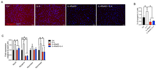 In this study, we investigated the role of IL-4 signaling in myoblast fusion and differentiation. In addition to myoblast fusion [26], IL-4 treatment also promoted myoblast differentiation in C2C12 cells (Figure 1A–C). In the IL-4-treated C2C12 cells, the expression of myogenic regulatory factors, MyoD and myogenin, and myomerger significantly increased, whereas the expression of myomaker was not affected (Figure 1F). Consistently, when we knocked down IL-4Rα expression in C2C12 cells, myoblast differentiation and fusion were suppressed (Figure 2) and the mRNA and the protein levels of myogenic regulatory factors and myomerger were significantly attenuated, whereas the expression of myomaker remained unchanged (Figure 3). These results suggest that the stimulation of the IL-4/IL-4Rα axis promotes myoblast fusion and differentiation, especially through the enhancement of MyoD, myogenin, and myomerger expression.
