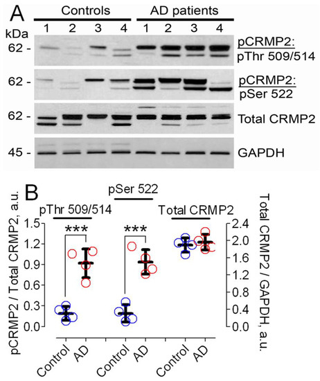 Earlier, it was reported that CRMP2 is hyperphosphorylated in postmortem brain tissues of AD patients [20,32,33]. We confirmed this finding in our experiments (Figure 1). CRMP2 was hyperphosphorylated at Ser 522 and Thr 509/514, whereas total CRMP2 expression was without change.