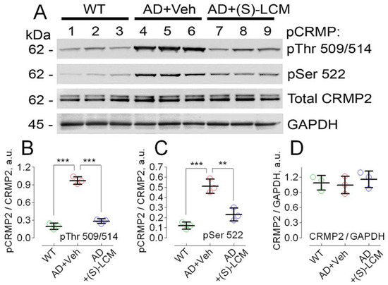 CRMP2 is hyperphosphorylated at Ser 522 and Thr 509/514, but total CRMP2 is unchanged in lysates of brain cortices of APP/PS1 mice compared to lysates from WT littermates. In (A), representative immunoblots. (S)-LCM significantly reduced CRMP2 phosphorylation. Lanes 1–3, WT mice; lanes 4–6, AD mice; lanes 7–9, AD mice treated with (S)-LCM. (S)-LCM was delivered by oral gavage (10 mg/kg body weight for 7 days prior to analysis). AD mice received a vehicle (Veh, 10 μL DMSO in 0.2 mL saline daily for 7 days before the test). In (B–D), statistical summaries. Green circles, wild-type (WT) mice; red circles, AD mice treated with a vehicle; blue circles, AD mice treated with (S)-LCM. Data are mean ± SD, ** p < 0.01, *** p < 0.001, N = 3 biological replicates. Data were analyzed by parametric one-way analysis of variance (ANOVA) with Holm–Sidak post-test.