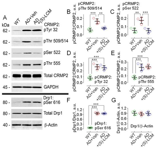 Hyperphosphorylation of CRMP2 at Ser 522, Thr 509/514, Tyr 32, Thr 555, and hyperphosphorylation of Drp1 at Ser 616 in cultured cortical neurons from APP/PS1 mice compared to neurons from WT littermates. (S)-LCM (10 µM for 7 days) significantly reduced CRMP2 phosphorylation at Ser 522 and Thr 509/514, but not at Thr 555 and Tyr 32 or at Ser 616 of Drp1. Cortical neurons were isolated from P1 APP/PS1 (AD) and WT mice of both sexes and cultured for 12–14 days in vitro (12–14 DIV). In (A), representative immunoblots. (B–G), statistical summaries based on densitometry data. Where shown, neurons were exposed to 10 µM (S)-LCM for the last 7 days before the experiments. β-actin and GAPDH are loading controls. Here and in other experiments with (S)-LCM applied to cultured neurons, 0.01% DMSO was used as a vehicle (Veh). Green circles, neurons from wild-type (WT) mice; red circles, neurons from AD mice treated with a vehicle; blue circles, neurons from AD mice treated with (S)-LCM. Data are mean ± SD, ** p < 0.01, *** p < 0.001, N = 4 separate experiments with neurons from different platings. Data were analyzed by parametric one-way analysis of variance (ANOVA) with Holm–Sidak post-test.