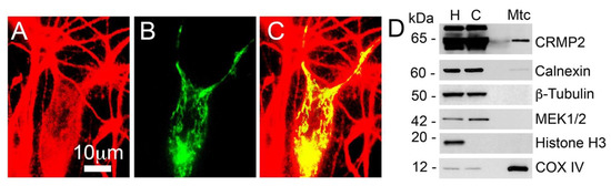 In our recent study, we demonstrated that CRMP2 is co-localized with mitochondria in the somata of cultured striatal neurons and plays a role in regulating mitochondrial dynamics in these cells [17,18]. As cortical neurons are among the most affected cell types in AD and synaptic deficits are a major factor in AD pathology [1,2], it was important to investigate whether CRMP2 is also co-localized with mitochondria in cortical neurons and involved in synaptic mitochondria. Our present study showed that CRMP2 is indeed co-localized with mitochondria in cultured cortical neurons (Figure 4A–C). CRMP2 is a highly expressed cytoplasmic phosphoprotein in brain tissues, and the CRMP2 staining in Figure 4 accurately reflects its abundance in neurons, rather than being a result of over-exposure. This image reflects the actual abundance of CRMP2 in neurons. CRMP2 expression is spread across the cell, providing a strong basis for CRMP2–mitochondria interaction. In these experiments, mitochondria were stained with mitochondrially targeted enhanced yellow fluorescent protein (mito-eYFP). The genetic construct encoding mito-eYFP was delivered to neurons by electroporation. This technique provides an approximate transfection rate of 10% [52]. Correspondingly, in Figure 4B only one neuron was transfected and expressed mito-eYFP and, therefore, mitochondria were visible only in this transfected neuron. In addition to immunocytochemistry experiments, using immunoblotting, we detected CRMP2 in synaptic (neuronal) mitochondria (Figure 4D), isolated from mouse brain cortices and purified on a 30% continuous Percoll gradient as reported [17,43]. Thus, CRMP2 directly interacts with synaptic mitochondria in cortical neurons.
