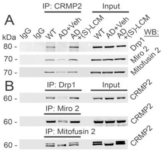 Next, we investigated the potential mitochondrial binding partners of CRMP2. Co-immunoprecipitation (co-IP) experiments with mouse cortical neurons in culture from APP/PS1 mice revealed that CRMP2 interacts with Drp1, Miro 2, and Mitofusin 2 (Figure 5) proteins involved in regulating mitochondrial motility and morphology [5].