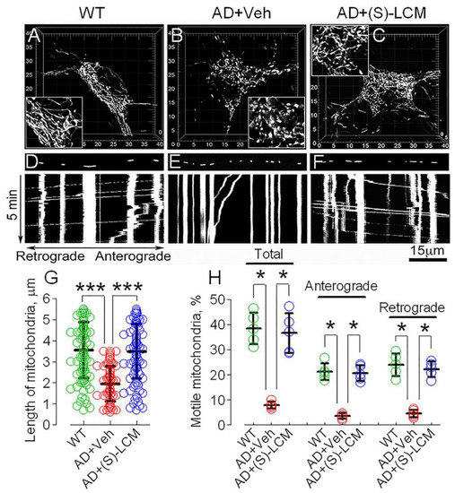Altered mitochondrial morphology and motility in cortical neurons in culture from APP/PS1 mice. (S)-LCM improved mitochondrial morphology and traffic. In (A–F), mitochondria in cultured cortical neurons (12–14 DIV) visualized with mito-eYFP and imaged with a spinning-disk confocal microscopy. Mitochondrial morphology was analyzed using 3D reconstruction of serial images (z-stacks). In Insets, the organelles are demonstrated at doubled magnification. In (A), neuron from WT mice; in (B), neuron from APP/PS1 mice, these neurons were treated with a vehicle (Veh, 0.01% DMSO) for 7 days before imaging; in (C), APP/PS1 neuron incubated with 10 μM (S)-LCM for 7 days before imaging; in (D–F), mitochondrial traffic in neurites of WT neuron (D), APP/PS1 neuron treated with a vehicle (Veh, 0.01% DMSO) for 7 days before imaging (E), and APP/PS1 neuron treated with 10 μM (S)-LCM for 7 days before imaging (F). Here, and in Figure 7, vertical traces represent immobile mitochondria, angled traces represent trafficking organelles. The bands with mitochondrial fluorescent images demonstrate the organelles at the beginning of experiments. Motility of mitochondria was documented for five minutes at 37 °C. In (G), the length of neuronal mitochondria in µm. Here, and in Figure 7, one hundred randomly selected mitochondria from 10–12 cells from three different platings were assessed employing Imaris Measurement Pro 6.4 software (Bitplane, South Windsor, CT, USA) [17,18,49]. In (H), fractions of moving organelles and mitochondria trafficking in retrograde and anterograde directions shown as percentage of total number of analyzed mitochondria. Green circles, neurons from wild-type (WT) mice; red circles, neurons from AD mice treated with a vehicle; blue circles, neurons from AD mice treated with (S)-LCM. Data are mean ± SD, * p < 0.05, *** p < 0.001, N = 5 separate experiments with neurons from different platings. Data were analyzed by nonparametric Kruskal–Wallis ANOVA on ranks followed by Tukey test.