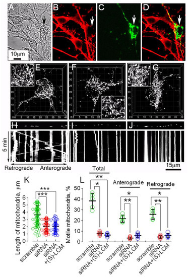 CRMP2 ablation using siRNA-augmented mitochondrial fragmentation and reduced mitochondrial motility in cultured cortical neurons (12–14 DIV) from WT mice. The results of representative experiments with cultured cortical neurons are shown. Neurons were isolated from P1 wild-type C57BL/6;C3H mice. In (A), phase-contrast bright-field image. In (B–D), typical immunochemistry staining is shown. (B), CRMP2 immunostaining. (C), visualization of mitochondria with mito-eYFP. (D), overlapped mitochondria and CRMP2 images. Arrows, neuron with successful transfection. Delivery of anti-CRMP2 siRNA (ACTCCTTCCTCGTG TACATTT) led to ablation of CRMP2 (B). In (E–G), mitochondrial morphology in cultured cortical neurons is shown. In (E), scramble siRNA did not change mitochondrial morphology. In (F), anti-CRMP2 siRNA resulted in an increased mitochondrial fission. In (G), a neuron with deleted CRMP2 and treated with 10 μM (S)-LCM for 7 days; mitochondria remained fragmented. Mito-eYFP was used to visualize mitochondria in live neurons. Mitochondrial morphology was assessed employing z-stacks of serial images and 3D reconstruction. In (H–J), representative kymographs illustrating mitochondrial motility are shown. Mitochondrial traffic was documented for 5 min at 37 °C. In (H), mitochondrial motility in a neuron treated with scramble siRNA. In (I), CRMP2 ablation with siRNA was accompanied by reduced mitochondrial traffic. In (J), a neuron with deleted CRMP2 and treated with 10 μM (S)-LCM for 7 days; mitochondrial traffic remained suppressed. In (K), the length of neuronal mitochondria in µm. In (L), fractions of moving organelles and mitochondria trafficking in retrograde and anterograde directions shown as percentage from total number of analyzed mitochondria. In (K,L), data are mean ± SD, * p < 0.05, ** p < 0.01, *** p < 0.001, N = 5 separate experiments with neurons from different platings. Green circles, neurons transfected with scramble siRNA; red circles, neurons transfected with anti-CRMP2 siRNA; blue circles, neurons transfected with anti-CRMP2 siRNA and treated with (S)-LCM. Data were analyzed by nonparametric Kruskal–Wallis ANOVA on ranks followed by Tukey test.
