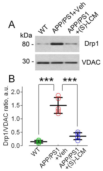Drp1 recruitment to mitochondria isolated from cultured cortical neurons from WT and APP/PS1 mice. In (A), the representative immunoblots with anti-Drp1 and anti-VDAC1 antibodies. VDAC1 was a loading control. Where indicated, neurons from APP/PS1 mice were treated with a vehicle (Veh, 0.01% DMSO) or with 10 μM (S)-LCM for 7 days before the experiment. In (B), statistical summary of these experiments. The data are shown as a ratio of Drp1/VDAC1. Green circles, neurons from wild-type (WT) mice; red circles, neurons from AD mice treated with a vehicle; blue circles, neurons from AD mice treated with (S)-LCM.Data are mean ± SD, *** p < 0.001, N = 5 separate experiments with neurons from different platings. Data were analyzed by parametric one-way analysis of variance (ANOVA) with Holm–Sidak post-test. a.u., arbitrary units.