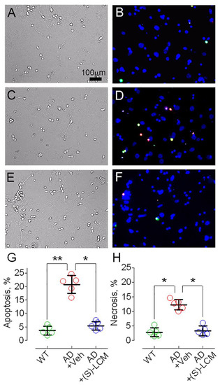 Apoptotic and necrotic cell death in cortical neurons in culture from APP/PS1 (AD) mice and WT littermates (WT). Neurons were cultured in vitro for 21 days and then stained with Hoechst 33342 (blue, nuclear marker), YO-PRO-1 (green, apoptosis marker), and propidium iodide (red, necrosis marker), respectively. (A,B), bright-field and fluorescent images of WT neurons. (C,D), bright-field and fluorescent images of AD neurons treated with a vehicle (Veh, 0.01% DMSO) for seven days before cell death assay. (E,F), phase-contrast bright-field and fluorescence images of AD neurons incubated with 10 µM (S)-LCM for seven days before cell death assay [18]. In (G,H), statistical summary of cell death in AD and WT neurons. Green circles, neurons from wild-type (WT) mice; red circles, neurons from AD mice treated with a vehicle; blue circles, neurons from AD mice treated with (S)-LCM. Data are mean ± SD, * p < 0.05, ** p < 0.01, N = 5 separate experiments with neurons from different platings. Data were analyzed by nonparametric Kruskal–Wallis ANOVA on ranks followed by Tukey test.