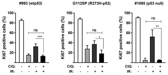 Effects of ClQ on GSCs proliferation in vitro. GSCs were treated with ClQ (30 µM), irradiation (IR, 2.5 Gy) or combination of ClQ+IR for 72 h and analyzed by immunofluorescence staining for Ki-67. Summary of the data from three independent experiments. Statistical significance was determined using Student’s t-test. (*), p ≤ 0.05; (**); p ≤ 0.01; (***), p ≤ 0.001. “ns”, not significant.