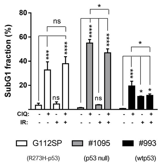 The results showed that the degree of ClQ-mediated proliferative inhibition in vitro is comparable or even greater than that induced by clinically relevant doses of ionizing radiation (2.5 Gy). Cell death assessments, using the sub-G1 assay, revealed that ClQ treatment leads to the increase in fractional DNA content in all GSCs tested, albeit to varying degrees, with wtp53 GSCs being the least susceptible to ClQ-induced cell death compared to R273H-p53 and p53 null GSCs (Figure 2 and Figure S4). Vice versa, wtp53 GSCs showed greater radiosensitivity in vitro than R273H-p53 or p53 null GSCs as evidenced by a moderate but significant increase in sub-G1 cells after IR in wtp53 GSCs but not in R273H-p53 or p53 null GSCs. Notably, the combined treatment with ClQ and radiation in vitro failed to significantly augment cell death rates, which were even reduced in wtp53 and p53 null GSCs compared to ClQ treatment alone (Figure 2). R273H-p53 GSCs did show a trend toward increased cell death after combined treatment with ClQ and IR but the difference between ClQ+IR and ClQ alone treatments was not statistically significant (Figure 1 and Figure S4c). Together, these data demonstrate that ClQ is effective in both inhibiting GSC proliferation and inducing GSC death in vitro and indicate that GSCs differing in the status of p53 vary in their susceptibility to ClQ either in a solo setting or in combination with IR.