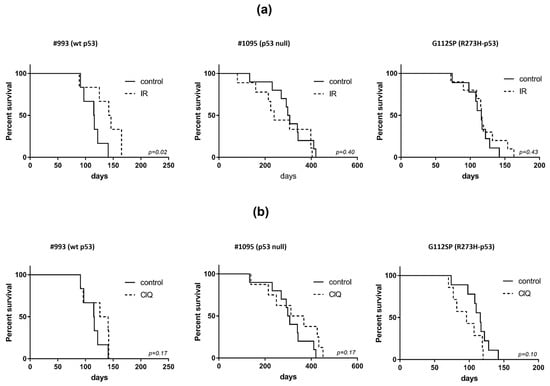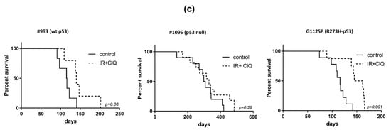 We next sought to determine if the proliferation-inhibiting and death-promoting impacts of ClQ, effective against in vitro propagating GSCs, can be realized in vivo and suppress GSC-driven tumor growth. To that end, ClQ impacts, alone or in combination with clinically relevant doses of hypofractionated IR (frIR, six daily fractions of 2.5 Gy), were evaluated in GSC xenografts as depicted in Figure S2. In vivo outcomes of frIR treatment showed good concordance with the patterns of GSC radiosensitivity in vitro. Consistent with in vitro radioresistance of p53-R273H and p53 null GSCs (Figure 1), their derived tumors also manifest a radioresistant phenotype (Figure 3a), whereas wtp53 GSCs, showing a greater higher degree of radiation-induced death in vitro (Figure 2), recapitulate a radiosensitive phenotype in vivo (Figure 3a). Unlike frIR, ClQ treatment in vivo poorly reproduces ClQ’s efficacy in inhibiting GSC proliferation and viability in vitro as evident from the lack of significant effect of ClQ treatment on xenografted GSCs irrespective of their p53 status (Figure 3b). Moreover, tumors grown from p53-R273H GSCs showed a tendency to grow even faster after the treatment with ClQ (Figure 3b). However, the combined treatment with ClQ and frIR proved effective in retarding p53-R273H tumors as evidenced by a significant (p = 0.001) prolongation of survival compared to the sham-treated control group (Figure 3c) or mice treated singly with ClQ or frIR (Figure 3a,b).