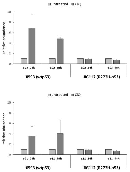 The p53-dependent and p53-independent mechanisms have been implicated in ClQ-induced death of cancer cells including non-stem glioma cells [,,,]. To address the relationship between ClQ and p53 activity in GSCs, we assessed the effects of ClQ on the p53 protein and p53 modulating factors in GSCs expressing wtp53 or R273H-p53 mutant. The results showed that ClQ treatment leads to the accumulation of p53 protein and its transcriptional target p21 in wtp53 GSCs but not in GSCs with transcriptionally impaired mutant R273H-p53 (Figure 4).