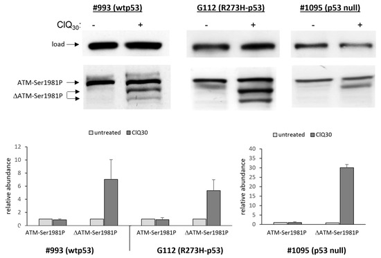 Dual effect of ClQ on ATM phosphorylation at Ser1981 and structural integrity of the ATM-Ser1981P protein. Top panel shows representative blots for ATM-Ser1981P in wtp53 (#993), R273H-p53 (G112) or p53-null GSCs after 72 h of treatment with ClQ. Graph shows the results of quantitative evaluations of the full-length and truncated ATM-Ser1891P levels by densitometry (n = 3 for each line). For total protein normalization, mitochondrial HSP70 or b-actin were used as internal loading controls.