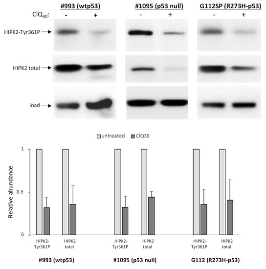 It has been shown that ATM fragmentation by proteolytic cleavage is one of the mechanisms inactivating its kinase activity towards Ser46 of the p53 protein in particular []. In the light of this knowledge, ClQ-induced fragmentation of ATM might provide a plausible explanation for why wtp53 accumulation induced by ClQ in GSCs is unaccompanied with p53 phosphorylation on Ser46 (Figure 4). However, ATM is not the only kinase that phosphorylates p53 on Ser46, which is also targeted by the homeodomain-interacting protein kinase 2 (HIPK2). HIPK2-mediated phosphorylation of p53-Ser46 is of special interest because it plays a crucial role in transcription of p53-regulated apoptotic genes. Therefore, we have also examined the effect of ClQ on HIPK2. Western blot assessments showed that ClQ treatment leads to a marked decline in the levels of both total HIPK2 and its activated form HIPK2-Tyr361P, which occurred in all tested GSCs irrespective of their p53 status (Figure 7).