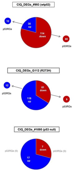 Schematic presentation of ClQ_DEGs identified in GSCs differing for the p53 status. “p53RGs”, p53-regulated genes. “up”, upregulated ClQ_DEGs. “down”, down-regulated ClQ_DEGs. Encircled numbers correspond to known p53RGs.