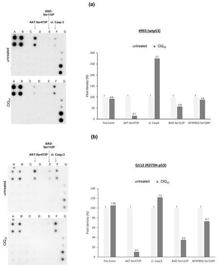 Effects of ClQ on apoptosis signaling pathways. Readouts from the APOSIG arrays incubated with cell lysates of (a) wtp53 or (b) R273H GSCs either untreated or treated with ClQ for 72 h and graphical presentation of the quantified readouts.