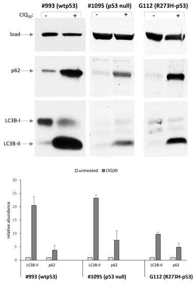 The reduction in AKT levels caused by ClQ occurred in all GSCs tested, indicating that this activity of ClQ is independent on the status of p53 and probably is conserved across different molecular subtypes of GSCs. Considering that AKT is the key factor promoting GB radioresistance, its reduction in ClQ-treated GSCs suggests that this mechanism might be involved in ClQ-mediated radiosensitization of glioma cells. This hypothesis is consistent with previous findings showing that AKT inhibition in conjunction with ClQ treatment sensitizes non-stem glioma cells to apoptosis [], an effect that has been explained by autophagy-related impacts of ClQ known to impair the fusion between autophagosomes and lysosomes []. With this knowledge in mind, we sought to determine if ClQ-induced reduction in AKT levels occurs concurrently with the autophagic inhibition in GSCs. To that end, autophagy p62 and LC3BII were assessed in untreated and ClQ-treated GSCs. The results showed that ClQ treatment leads to a robust increase in both p62 and LC3BII in all GSCs tested (Figure 11).