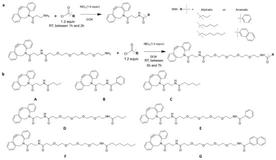 Syntheses of hydrophobic moieties. (a) Reaction schemes of DBCO-NH2 and DBCO-PEG4-NH2 coupling to acyl chloride-modified hydrophobic moieties. (b) Presentation of the seven hydrophobic moieties that were used for our study. For some moieties, the hydrophobic part was located close to DBCO (A, B, C). For others (D, E, F, G), PEG4 linkers were present between DBCO and hydrophobic parts.