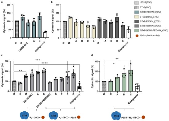 Relative comparisons of membrane translocation of engineered STxB variants to the cytosol, using the Cyto-SNAP assay. Capital letters correspond to the hydrophobic moiety conjugated to STxB (from A to G as presented in Figure 2, Ø: no hydrophobic moiety). In all experiments, the cytosolic signal is expressed as a percentage of the signal obtained for the synthetic STxB(70C) control. (a) Comparison of aliphatic and aromatic hydrophobic moieties conjugated to the variant STxB(H58KN3)(70C). No significant increase in cytosolic signal was observed. (b) Comparison of aliphatic and aromatic hydrophobic moieties with or without PEG4 linker conjugated to the variants STxB(D3KN3)(70C) and STxB(E10KN3)(70C). No significant increase in cytosolic signal was observed, even with a PEG4 linker. (c) Comparison of a set of hydrophobic moieties conjugated to the variant STxB(N59KN3)(70C). The translocation capacity of STxB increased with the hydrophobicity of the moieties. (d) Comparison of hydrophobic moieties conjugated to the variant STxB(N59K-PEG4-N3)(70C). Positioning the PEG linker between STxB and the azide increased STxB translocation compared to its localization between the DBCO and the hydrophobic moiety. * p < 0.05, ** p < 0.005, *** p ≤ 0.0005, **** p < 0.0001.