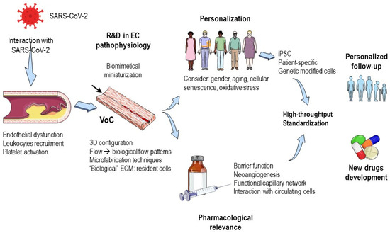 Vessel-on-a-chip (VoC) opportunities in COVID-19 research. VoC models for COVID-19 would allow the study of the pathophysiology of the disease in endothelial cells, analyzing the interaction of SARS-CoV-2 with endothelial function, leukocytes recruitment and platelet activation. In these models, “personalization” could be implemented through induced pluripotent stem cells, the implementation of patient-specific characteristics or genetic modified cells. Point-of-care characteristics should be implemented in the models to guarantee massive testing under standardized protocols. These characteristics could be incorporated for the personalized follow-up of the disease or its sequalae (long COVID) and for the research of new drugs against COVID-19 or to test the effects of common cardiovascular drugs. All of this is now possible thanks to the development of the microfabrication techniques for biomimetical miniaturization, which allow the needed pharmacological relevance in important functions of the endothelium. Abbreviations: EC: endothelial cells, ECM: extracellular matrix, iPSC: induced pluripotent stem cells, R&D: research and development, SARS-CoV-2: severe acute respiratory syndrome coronavirus 2, VoC: vessel-on-a-chip.