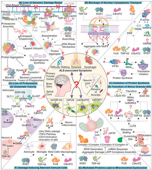 17-AAG,17-allylamino-17-demethoxy-geldanamycin; 17-DMAG, 17-Dimethylaminoethylamino-17-demethoxygeldanamycin; ACD, α-crystallin domain; AEG1, astrocyte-elevated gene 1; ALS, amyotrophic lateral sclerosis; AP-1, activator protein 1; ASK1, apoptosis signal-regulating kinase 1; ATM, ataxia telangiectasia-mutated; ATR, ATM and RAD3-related; BAG1/3, BAG family molecular chaperone regulator 1/3; BiP, binding protein; C306, cysteine residue 306; C9orf72, chromosome 9 open reading frame 72; CAMK, Ca2⁺/calmodulin-dependent protein kinase; CD14, cluster of differentiation 14 receptor; cGAS, cyclic GMP-AMP synthase; CHCHD10, coiled–coil–helix–coiled–coil–helix domain-containing protein 10; CHIP, carboxy terminus of Hsc70-interacting protein; Chk1/2, checkpoint kinase 1/2; CRM1, chromosomal maintenance 1; DPR, dipeptide repeat; DRiPs, defective ribosomal products; Drp1, dynamin-related protein 1; EAAT2, excitatory amino acid transporter 2; eIF2α, eukaryotic initiation factor 2 alpha; ERAD, endoplasmic reticulum-associated degradation; ETC, electron transport chain; FUS, fused in sarcoma; GABA, gamma-amino butyric acid; GAD1, glutamate decarboxylase 1; GCN2, general control nonderepressible factor 2 kinase; GGA, geranylgeranylacetone; GLAST, glutamate aspartate transporter 1; GLT-1, Glutamate transporter 1; GluR, Glutamate receptor; Grp78, glucose-regulated protein 78 kDa; HDAC, histone deacetylase; hnRNPA3, heterogeneous nuclear ribonucleoprotein A3; HRI, heme-regulated eIF2α kinase; Hsc70, heat shock cognate 71 kDa protein; HSF1, heat shock factor 1; HSP, heat shock protein; HSR, heat shock response; IKK, inhibitor of nuclear factor kappa-B kinase; IRE1, inositol-requiring enzyme 1; IκB, inhibitor of nuclear factor kappa B; MARK2, microtubule affinity-regulating kinase 2; MICOS, mitochondrial contact site- and cristaorganizing system; MIF, macrophage migration inhibitory factor; MMEJ, nicrohomology-mediated end joining; Mre11, Meiotic recombination 11; mtDNA, mitochondrial DNA; NF-κB, nuclear factor kappa B; NHEJ, non-homologous end joining; NLRP3, NLR family pyrin domain containing 3; NLS, nuclear localization signal; NPM1, nucleophosmin 1; NRE, nucleotide repeat expansion; NUPs, nucleoporins; OPTN, optineurin; OXPHOS, oxidative phosphorylation; PARP1, poly [ADP-ribose] polymerase 1; P-eIF2α, phosphorylated eukaryotic Initiation factor 2 alpha; PERK, PKR-like ER resident kinase; PKCδ, protein kinase C delta; PKR, protein kinase R; poly(GA), poly(glycine-alanine); poly(GP), poly(glycine-proline); poly(GR), poly(glycine-arginine); poly(PA), poly(proline-alanine); poly(PR), poly(proline-arginine); PP1, protein phosphatase 1; PPI, protein–protein interaction; PQC, protein quality control; PSD13, proteasome assembly chaperone 13; PSMG2, proteasome assembly chaperone 2; RAN, repeat-associated non-ATG; RBP, RNA-binding protein; RGG, Arg-Gly-Gly; ROS, reactive oxygen species; RRM, RNA recognition motif; SFPQ, splicing factor proline and glutamine-rich; SG, stress granule; sHsp, small heat shock protein; SMCR8, Smith Magenis syndrome chromosome region, candidate 8; SNAP23, synaptosomal-associated protein 23; SOD1, superoxide dismutase 1; STING, stimulator of interferon genes; TDP-43, TAR DNA-binding protein 43; TFEB, transcription factor EB; TNFα, tumor necrosis factor α; UBQLN2, ubiquilin 2; UBXN, UBX domain containing protein; UPR, unfolded protein response; UPS, ubiquitin proteasome system; USP19, ubiquitin-specific peptidase 19; VCP, valosin-containing protein; VDAC, voltage-dependent anion channel; WDR41, WD repeat domain 41; XRCC1, X-ray repair cross-complementing protein 1; YY1, Yin Yang protein 1.