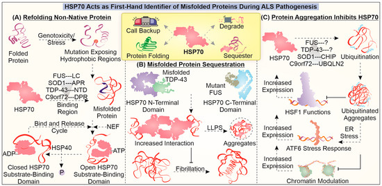 Role of HSP70 in dealing with mutant proteins in ALS: The figure illustrates the fundamental involvement of HSP70 in dealing with misfolded aggregates and their associated toxicities during the pathogenesis of ALS. HSP70 is found to engage in specifically identifying aberrant protein conformations of ALS-associated mutant protein and enhance their refolding (A), initiate sequestration (B), and instigate their clearance. The aggregation of misfolded proteins can entrap HSP70 and HSF1, reducing HSP70 levels during ALS (C).