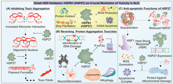 Unveiling the crucial roles of HSPB1 (HSP27) in combatting mutant proteins linked to ALS. The figure illustrates how HSP27 is critical in mitigating toxicity-associated effects of misfolded aggregates during the progression of ALS. HSP27 is found to inhibit the toxic amyloidosis of mutant aggregation-prone proteins during ALS (A) and enhance the cytoprotective response against protein aggregation-associated toxicities (B). In addition, it can also act as an anti-apoptotic protein (C).