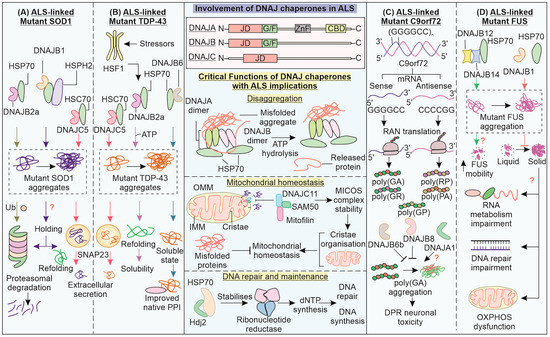 Exploring the involvement of DNAJ chaperones in the ALS pathomechanism: DNAJ proteins affect ALS pathomechanisms by influencing the folding status and solubility of SOD1, TDP-43, C9orf72, and FUS. (A) DNAJB2/B1 mediates clearance of mutant SOD1, possibly in a proteasomal-dependent manner, whereas DNAJC5 can mediate extracellular secretion of mutants TDP-43 and SOD1. (B) DNAJB2a, under the control of HSF1 and DNAJB6, can improve the solubility of mutant TDP-43. (C) C9orf72 DPRs are synthesized via the RAN translation of expanded C9orf72 mRNA of both types. DNAJB6b and DNAJB8 increase the clearance of C9orf72 DPR accumulation, while the role of DNAJA1 is not clear. (D) DNAJB12 and DNAJB14, along with HSP70, inhibit the impaired phase separation of FUS, which could have implications for the mentioned cellular processes. Other critical functions of DNAJ proteins, such as disaggregation, mitochondrial homeostasis, and DNA synthesis and repair can have implications for ALS.