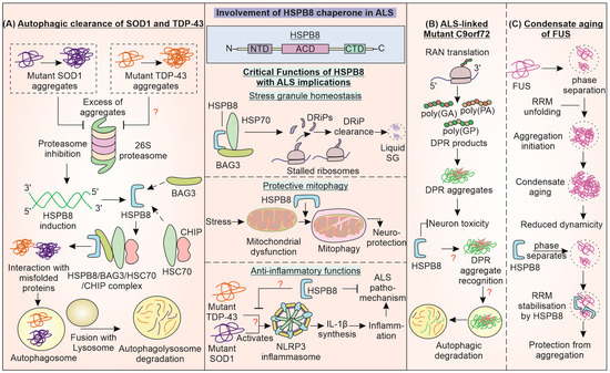 Involvement of HSPB8 Chaperone in Pathogenesis of ALS: The small HSP HSPB8 directs mutant SOD1, TDP-43, and C9orf72 proteins towards autophagic clearance upon proteasome inhibition. (A) HSPB8 performs this function, possibly in a complex with BAG3, HSC70, and CHIP. (B) HSPB8 promotes the autophagic degradation of C9orf72 DPRs. (C) HSPB8 also inhibits the condensate aging of the ALS-linked FUS protein, thereby preventing the hardening of stress granules. The critical functions of HSPB8 in stress granule homeostasis, mitophagy, and inflammation, can have implications for ALS.