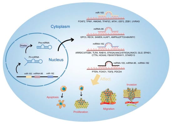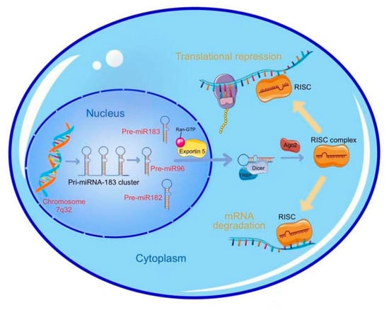 Li, S.; Meng, W.; Guo, Z.; Liu, M.; He, Y.; Li, Y.; Ma, Z. The miR-183 Cluster: Biogenesis, Functions, and Cell Communication via Exosomes in Cancer. Cells 2023, 12, 1315. https://doi.org/10.3390/cells12091315