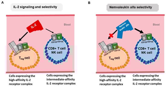 The binding of IL-2 to its receptor (IL-2R) leads to the activation of key signaling pathways including JAK/STAT, PI3K/AKT, and MAPK [12]. IL-2R consists of α (CD25), β (CD122), and γ (CD132) subunits. IL-2 binds with low affinity (Kd ~10−8 M) to IL-2Rα, with intermediate affinity (Kd ~10−9 M) to IL-2Rβ and IL-2Rγ, and with high affinity (Kd ~10−11 M) to heterotrimeric receptors containing IL-2Rα, IL-2Rβ, and IL-2Rγ. IL-2Rα is mainly expressed by Treg cells, activated CD4+ and CD8+ T cells, B cells, CD56-high NK cells, endothelial cells, and mature dendritic cells. IL-2Rβ and IL-2Rγ are predominantly expressed by Treg cells, memory CD8+ T cells, monocytes, NK cells, and neutrophils [11,12,13]. The co-expression of all three subunits is needed for high-affinity IL-2 binding, and Tregs mainly express the high-affinity trimeric IL-2 receptor, whereas CD8+ T cells and NK cells predominantly express the intermediate-affinity dimeric IL-2 receptor [12] (Figure 1A).