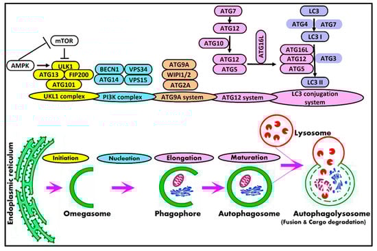 Autophagy is a complex process that is regulated by a series of protein complexes and signaling pathways. In mammals, the core autophagy-related (ATG) genes and their protein products are generally classified into the ULK1 protein kinase complex [28], Vps34-beclin1 class III PI3-kinase complex [29,30], ATG9A transportation system [31,32], ATG12 conjugation system [33], and LC3 conjugation system [34]. Table 2 illustrates the components and role of autophagy complexes participating in the mammalian autophagy machinery.