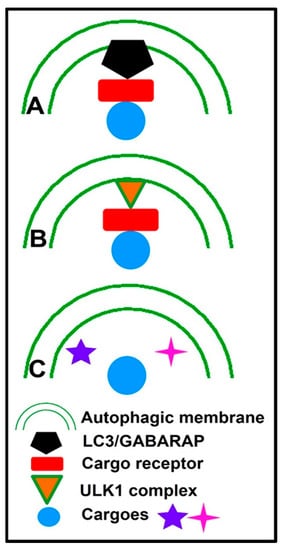 Selective autophagy is principally dependent on both the recognition of the cargo and the coupling of the cargo to the phagophore, which can be carried out by proteins called selective autophagy receptors or cargo receptors [77]. A representative overview of the mechanisms of selective macroautophagy is illustrated in Figure 2. The first mechanism involves selective autophagy receptors that act as a bridge between the phagophore and cargo to facilitate the recruitment of autophagic machinery, mainly by the binding of LC3 and then the degradation of the cargo [78].