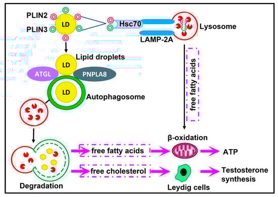 Interestingly, autophagy regulates testosterone synthesis by facilitating cholesterol uptake in Leydig cells. Activated steroidogenic cells demand high levels of cholesterol substrates. Cholesterol acts as a substrate for testosterone biosynthesis in Leydig cells [199]. The uptake of cholesteryl esters is selectively mediated by the class B type I (SR-BI) scavenger receptor in steroidogenic cells [200]. Na+/H+ exchanger regulatory factor (NHERF2) is a protein binding partner for SR-BI that negatively regulates the expression of the SR-BI protein via the inhibition of its de novo synthesis [201]. Gao et al. [102] provided evidence that autophagy in Leydig cells regulates SR-BI via the enhancement of NHERF2 degradation; thus, autophagy could facilitate and enhance cholesterol uptake into Leydig cells during testosterone synthesis.