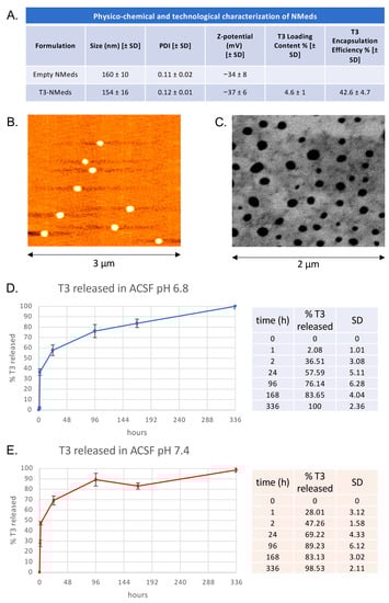 Physico-chemical, technological, and morphological characterization and T3 release profile of T3-NMeds: (A) Table showing the values of particle size, PDI, and Z-potential for both empty and T3-loaded NMeds and T3 encapsulation efficiency and loading content; (B) AFM and (C) STEM image of T3-NMeds; (D) T3 release profile of T3 released at different time points at 37 °C in ACSF buffer at pH 6.8; (E) T3 release profile and percentages of T3 released at different time points at 37 °C in ACSF buffer at pH 7.4. All data are represented as the mean ± standard deviation (SD), n = 3.