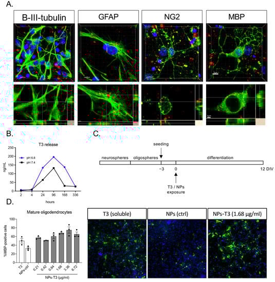 We then tested the capability of NMeds to penetrate inside the cells and functionally release T3 to induce OPC differentiation. We used a cell platform based on spontaneously differentiated neural stem cells (NSCs) to analyze the NMed cellular internalization in the three neuronal lineages and the NSC-derived OPCs to test the differentiation potential of the T3-NMeds [,].