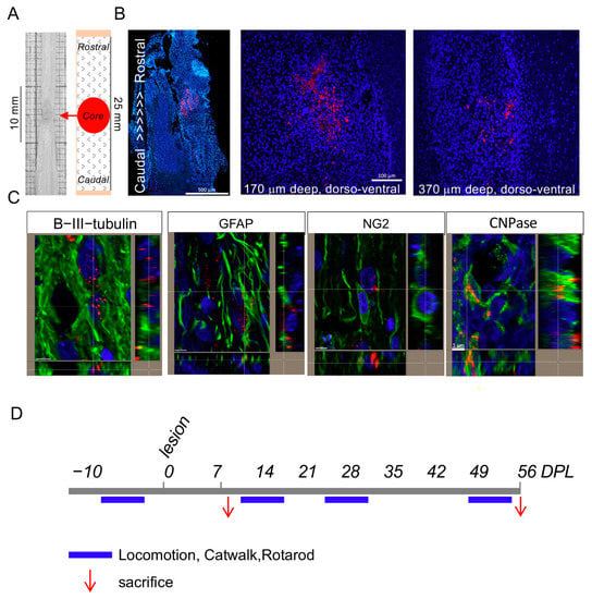 At sacrifice, animals were deeply anesthetized with isoflurane (3–4%) in 2% O2 and perfused with 4% paraformaldehyde and 14% picric acid in Sorensen Buffer 0.2 M (pH 6.9). Tissue analysis was performed both for histology and immunofluorescence by dissection of the spinal cord after at least five washes in 0.2 M Sorensen buffer containing 5% sucrose and frozen with liquid N2. A 25 mm segment was collected at the core of the lesion, 10 mm rostral and 10 mm caudal, starting at the lesion site. Longitudinal cryostat sections with a thickness of 14 μm were collected on the cryostat (Leica CM1950 Biosystems, Walldorf, Germany). Three different levels were sampled at a distance of 210 μm from each other in a dorso-ventral sense for histology and immunofluorescence studies, while for the biodistribution study, the entire spinal cord was serially sectioned. Sections were stained with Toluidine Blue and Luxol Fast Blue in order to evaluate the percentage of lesioned area and white matter loss, or processed for immunofluorescence using the following primary antibodies: anti-GFAP (Rabbit, 1:500, Dako, Santa Clara, CA, USA); anti-OX-42 (Mouse, 1:250, Serotec, Endeavour House, Kidlington, UK); anti-β-III-tubulin (Mouse, 1:250 Santa Cruz); anti-NG2 (Rabbit 1:100, Millipore, Merck S.p.a., Milan, Italy); anti-CNPase (Mouse, 1:100 Millipore, Merck S.p.a., Milan, Italy). Secondary antibodies conjugated with Rhodamine Red™-X (RRX) (1:200, Jackson Immuno Research, Cambridgeshire, UK) and Cy2 (1:200, Jackson Immuno Research, Cambridgeshire, UK) were used. Immunoreactivity analyses were performed using NIS Elements AR software (v 4.30.02, Nikon, Tokyo, Japan), and the binary area fraction was calculated for each antibody and used for analysis [].