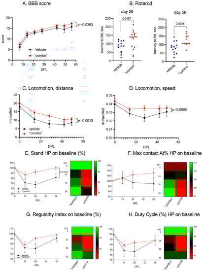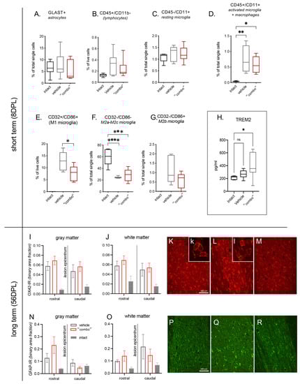 Taking all these data together, it is possible to conclude that type M1 microglia were strongly reduced, although not suppressed, by the “combo” treatment. Levels of the microglia-associated marker TREM2 in the CSF at 8 DPL also showed a significant increase in treated rats (Figure 4H).