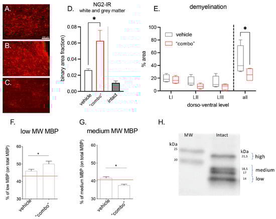 MBP Western blot analysis was carried out according to a previously published procedure with slight modifications []. Proteins were isolated from the R3 portion using QIAzol Lysis Reagent (Qiagen, Hilden, Germany) after homogenization according to the manufacturer’s instructions. Briefly, the tissue was homogenized, and 180 μL of chloroform was added to each sample. Then the samples were centrifuged at 12,000× g for 15 min at 4 °C for separation in the three phases: an upper, colorless, aqueous phase containing RNA; a white interphase; and a lower, red organic phase containing proteins. The interphase and lower part were isolated, and ethanol was added. The DNA was sedimented by centrifugation, and the supernatant was transferred to a new test tube. Isopropanol was added to precipitate proteins, and further centrifugation was carried out. After removing the supernatant, a guanidine (0.3 M) in ethanol solution was added to the pellet and incubated for 20 min, then centrifuged twice. The pellet was resuspended in 100% ethanol, left to incubate for 20 min and centrifuged. The pellet was air-dried for 10 min, then a solution of Urea (10 M)-DTT (50 mM) was added. The solution was incubated at 95° for 3 min and then transferred to ice; it was sonicated 10 times, and a freeze/thaw cycle was performed. One last centrifugation was carried out, and the supernatant containing the proteins was moved to a new tube. For each sample, 120 µg of starting tissue and the marker protein (Precision Plus Protein Standards, Bio-Rad) were added to a solution of Laemmli/β-mercaptoethanol. The proteins were resolved in 4–20% Mini-PROTEAN TGX Stain-Free Gels (BiodRad), and the marker protein was always loaded in the external wells (lanes 1 and 10). Nitrocellulose membrane (Bio-Rad AmershamProtran 0.45 µm) was used for protein transfer. To be in line with the principles of 3Rs, thus reducing the number of samples from animals with a suffering phenotype and also reducing the amount of primary antibody, the membrane was cut after the transfer using the 37 kDa bands as a guide, and the lower portion of the membrane was processed with MBP antibody. A solution of 2.5% BSA in TBST (Tris Buffer Saline solution containing 1% Tween20) was used for 1 h of blocking. Incubation with the primary antibody (rabbit MBP DAKO, Santa Clara, CA, A0623, 1:2000) was performed overnight at 4 °C, whereas incubation with HRP-conjugated secondary antibodies (goat antiRb, BioRad-cat.1706515, 1:5000) and HRP-conjugated protein for marker visualization (Precision Protein StrepTactin HRP-conjugate, Bio-Rad, 1:10,000) was performed for 1 h at RT. Three washes with TBST were performed after incubation with the antibodies, either the primary or both the primary and secondary. Clarity Western ECL Substrate (Bio-Rad, −5 min incubation at RT in darkness) and the BioRadChemi DOC MP imaging system were used to detect the immunoreactive signal.