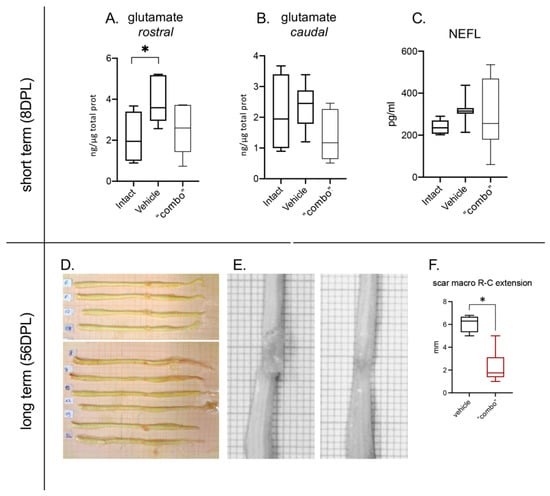 The tissue analysis shortly after the injury indicated that 3× “combo” was effective in modifying key players in secondary degeneration induction and progression. For example, the lesion-induced increase of glutamate in tissues was prevented in treated rats, reducing the effects of glutamate excess such as the triggering of cell death associated with secondary degeneration, involving the NMDA receptor in neurons [], AMPARs in oligodendrocytes [], and Ca++ overloading as a common mechanism []. This role of the 3× “combo” in mitigating secondary degeneration is reinforced by results on the functional outcome. After the initial traumatic damage, 3× “combo”-treated rats show a minor deficit compared to animals treated with vehicle, and a progressive improvement is evident at 28 DPL, which is maintained at 56 DPL.